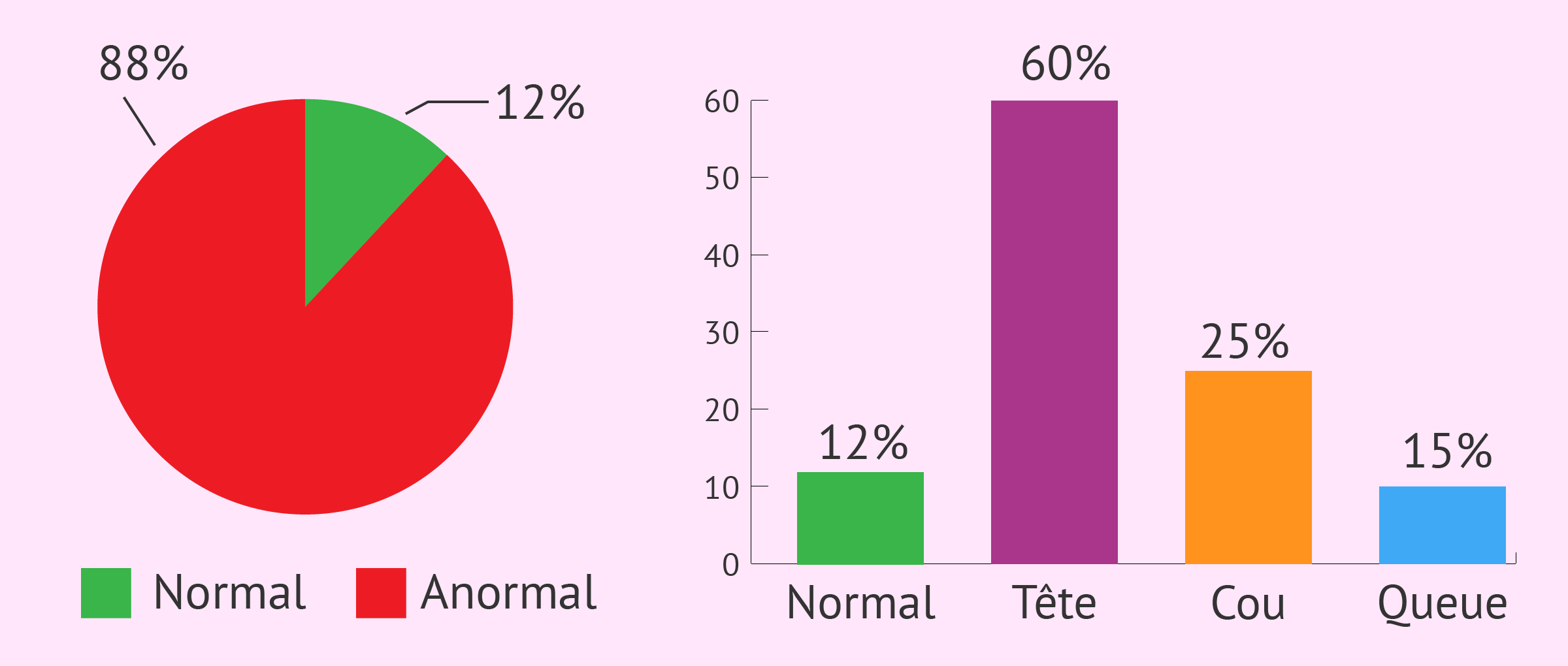 Les résultats du spermogramme peuvent être représentés par des tableaux ou des diagrammes pour rendre les données plus visibles. En ce qui concerne la morphologie des spermatozoïdes, on indique d'abord le pourcentage de spermatozoïdes normaux et anormaux, puis le nombre d'anomalies trouvées dans chaque zone du sperme.