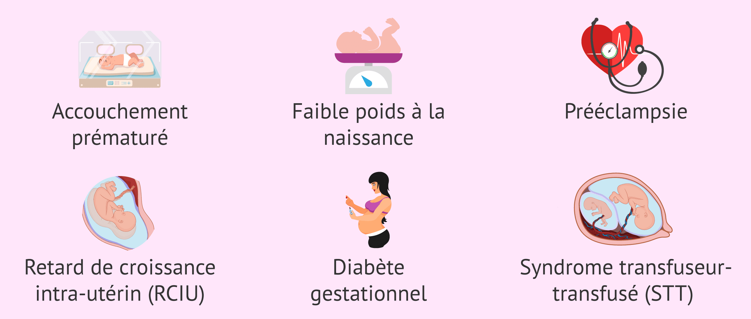 L'un des principaux risques de la grossesse multiple est l'accouchement prématuré et le faible poids à la naissance des bébés qui en découle. De plus, les grossesses de plus d'un bébé sont également associées à une plus grande tendance à développer une hypertension artérielle ou une pré-éclampsie, ainsi qu'un retard de croissance intra-utérin (RCIU), un diabète gestationnel et le syndrome transfuseur-transfusé (ou syndrome de transfusion fœto-fœtale).