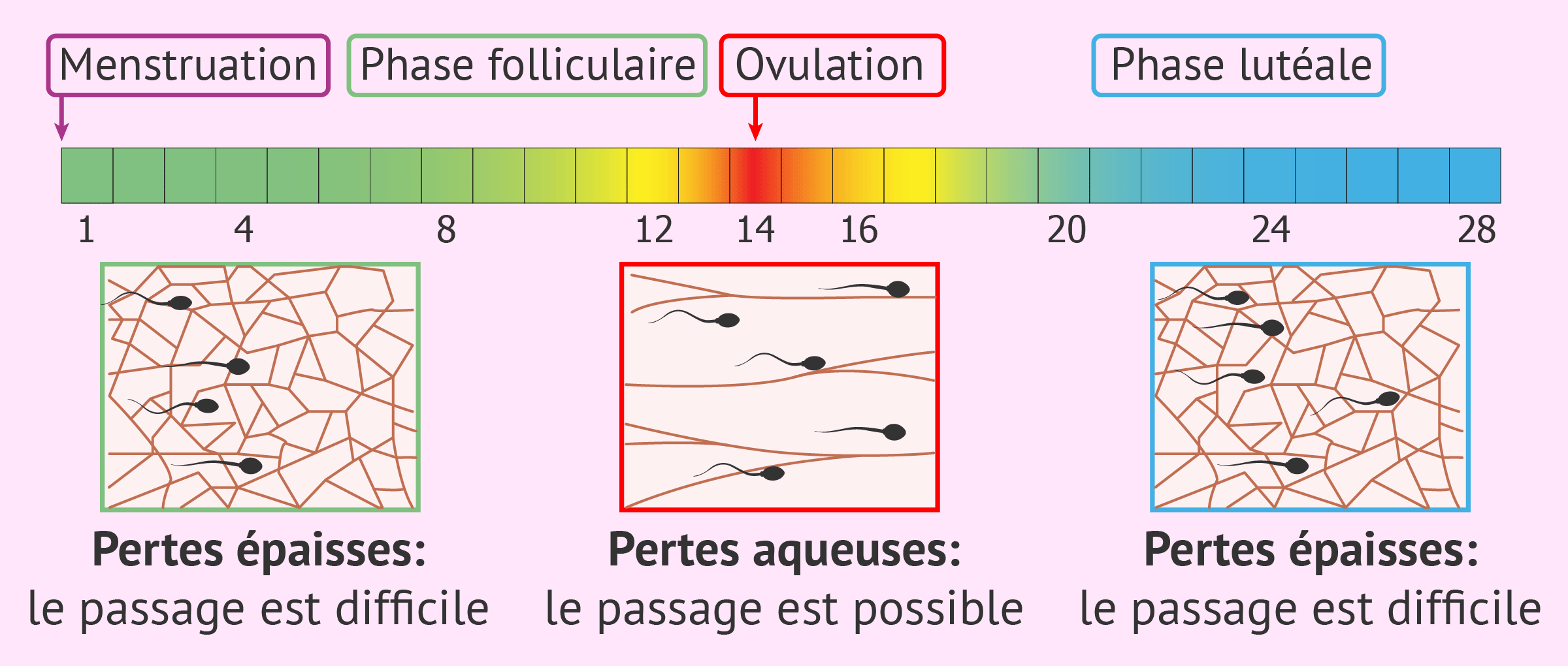 Pendant les phases folliculaire et lutéale, la glaire est épaisse et met en difficulté le passage des spermatozoïdes et des microorganismes qui provoquent l'infection. En revanche, pendant la période proche de l'ovulation. la glaire est plus aqueuse et permet le passage des spermatozoïdes pour que la fécondation puisse se passer.