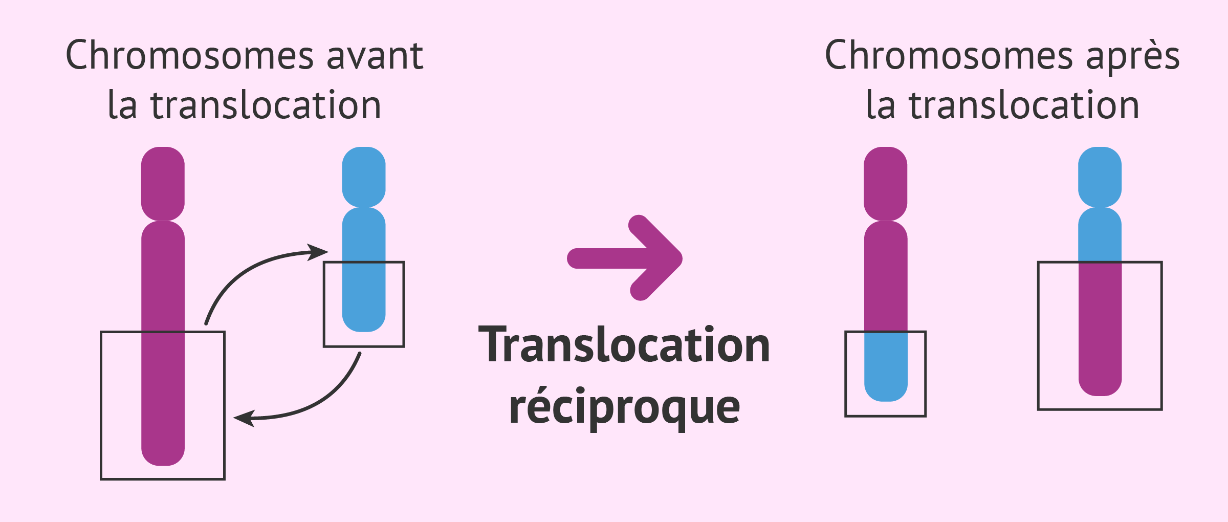 Une translocation a lieu lorsqu'il y a un échange de matériel génétique (un fragment de chromosome) parmi différents chromosomes ou lors des unions de chromosomes.