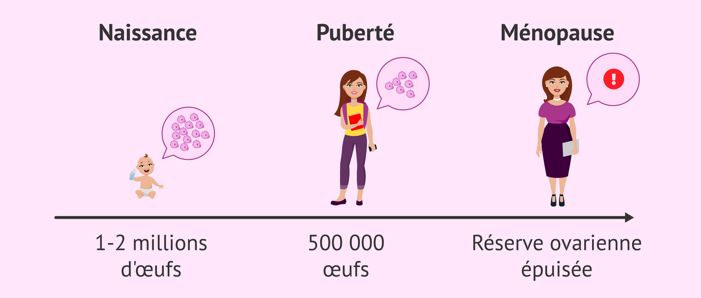 Au moment de la naissance, une femme a un nombre fini d'ovocytes dans ses ovaires, soit environ 1 à 2 millions d'ovocytes. Cependant, ce nombre aura déjà été réduit à environ 500 000 ovocytes à la puberté.