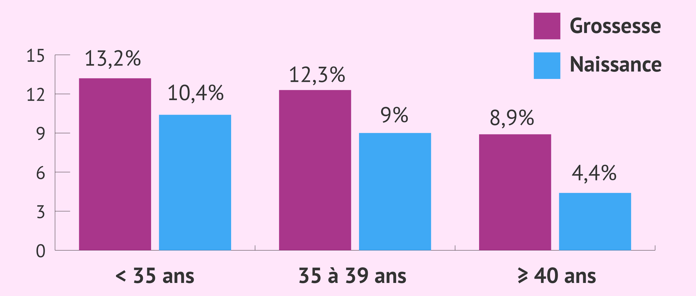 Les taux de réussite pour les inséminations artificielles sans donneur (IAC) sont assez bas, comme le montre ce graphique. À partir d'environ 37 ans, les taux de grossesse et de naissance chutent. C'est pourquoi cette technique de PMA n'est plus recommandé à cet âge.