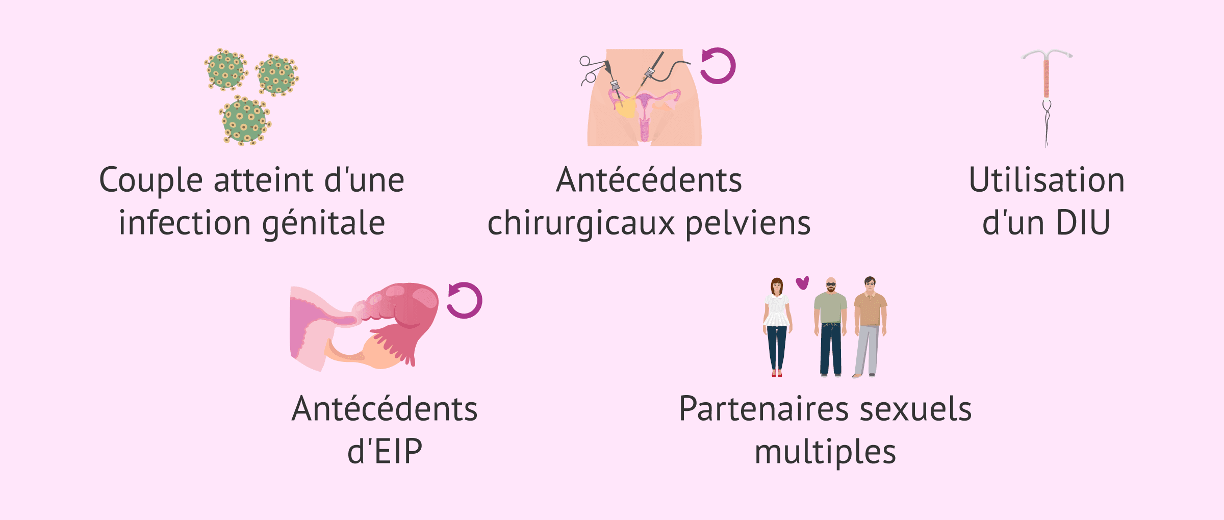 De plus, certains facteurs augmentent le risque de souffrir de cette affection tubaire, comme par exemple le fait d'avoir des partenaires sexuels multiples ou des antécédents de MIP (maladie inflammatoire pelvienne).