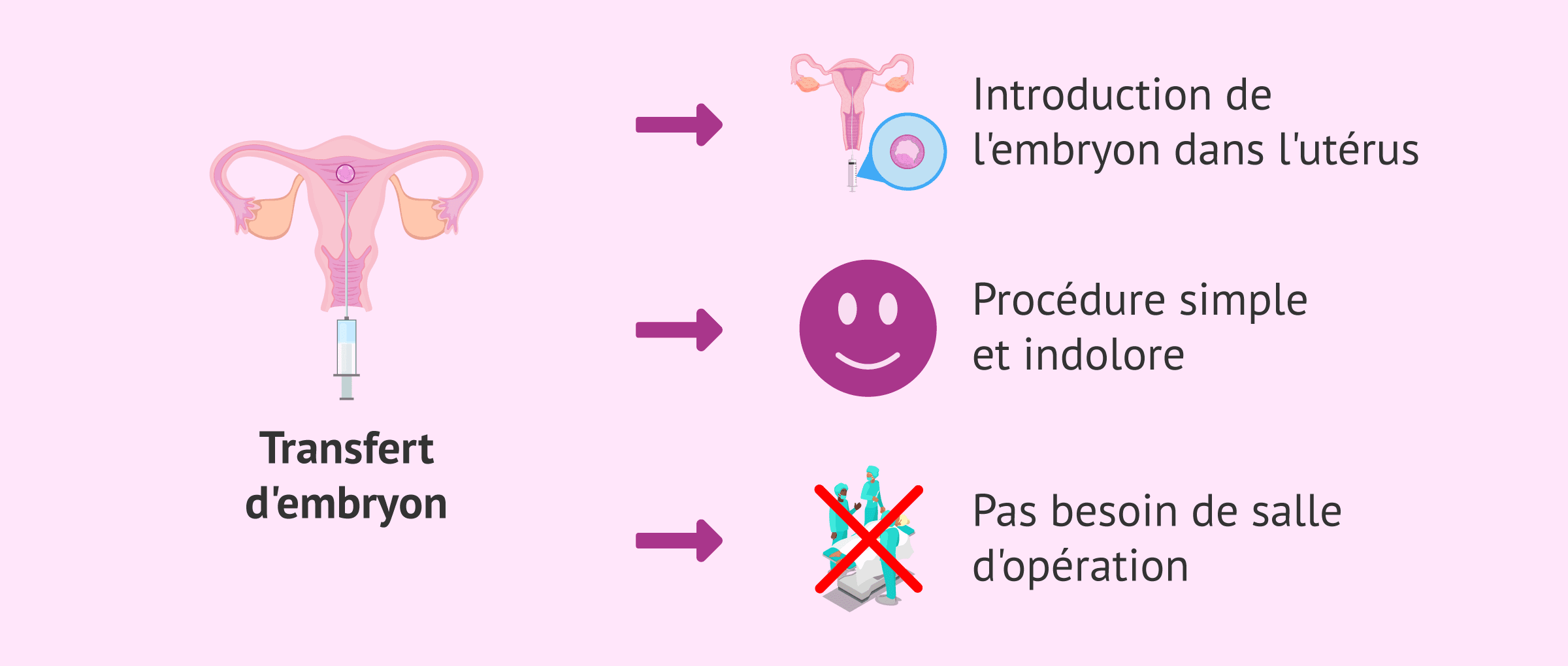 Le processus de transfert d'embryons est simple et indolore, il ne nécessite donc pas d'anesthésie et n'a pas besoin d'être réalisé en salle d'opération.